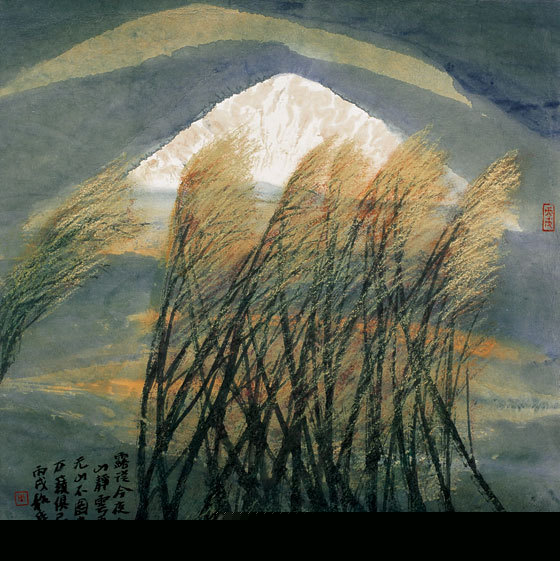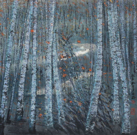 周韶華的作品不單單是描繪物象本身,更多的是物象所滲透出來的文化內(nèi)涵,這也是他的作品被大家追捧的原因。他把對山河的描繪與人文精神融合在一起,從他的一些著述和題跋中可以看到,如作品《萬籟吟秋》中的題跋“露從今夜白,山靜云更稀,無山不圖畫,萬籟俱已寂”,再如作品《初春的小白楊》的題跋“輕風拂綠冰初路,細雨消塵云未散。淡淡著煙濃著月,深深籠水淺籠沙。”