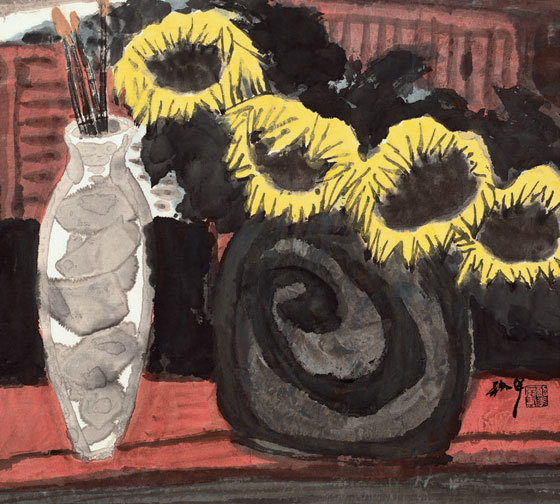 他在表現(xiàn)自然、人文精神的過程中,投入了自己更多的情感,即使是花卉、靜物作品也是如此,如作品《秋葵》,在色彩的使用上,大膽夸張,敢出驚人之筆,以楚文化為基調(diào)來創(chuàng)作,更能與觀者產(chǎn)生共鳴。鮮明的紅黑二色為畫面的主要基調(diào),再點綴四朵黃色的向日葵,滿構圖給人以強烈的視覺沖擊力,作品形式構成上的匠心獨運,與傳統(tǒng)中國畫拉開了較大的距離,同時也形成了個人鮮明的藝術特色。周韶華的作品,除非由于特殊的需要,畫面幾乎不留白。同時周韶華的瓷板畫里面依然能清晰看到水墨的暈透,它可以像瓷器一樣代代相傳,不怕蟲、不怕潮,流傳的更久。