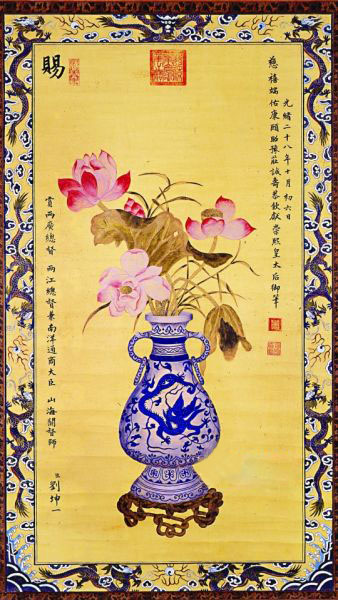 近日,在順德盛世傳承藝術(shù)館舉辦的“明清書畫大家展覽”中,觀眾得以一窺慈禧太后墨跡。展覽中展出的是慈禧在光緒二十八年賜予兩江總督兼南洋通商大臣劉坤一的一幅繪畫作品《瓶蓮圖》,鈐印有“慈禧皇太后御筆之寶”。中國南方書畫院副院長、國家文物局書畫鑒定專家陸小明表示:“這幅作品使用的是加了黃顏色的熟宣,并請工匠給宣紙四邊畫了龍紋。此外,一般人很少在作品中蓋這么大的印章,而且不會蓋在正中間,只有皇帝才會這么做,皇帝認(rèn)為自己天下第一,所以會把印蓋在‘天’上。”