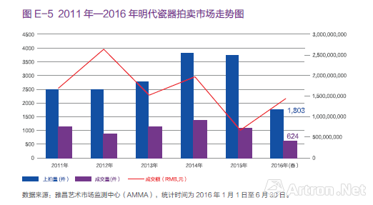 明清瓷器作為瓷雜板塊的中堅(jiān)力量,自市場(chǎng)進(jìn)入調(diào)整期以來(lái),其表現(xiàn)一直不溫不火。雅昌藝術(shù)市場(chǎng)監(jiān)測(cè)中心(AMMA)在《2015 年秋拍中國(guó)藝術(shù)品市場(chǎng)調(diào)查報(bào)告》中明確提出明清瓷器價(jià)值將得到回歸,這一點(diǎn)在2016 年春拍市場(chǎng)中也得到了正確并合理的驗(yàn)證。在2016 年香港佳士得“三十周年志慶拍賣(mài):世紀(jì)珍藏”專(zhuān)場(chǎng)中,一件“明宣德 青花五爪云龍紋大罐”以1.34 億元人民幣成交。此罐被認(rèn)為是“20 年來(lái)拍場(chǎng)出現(xiàn)的最好瓷器”,在傳世的明宣德青花瓷器中,相似形制的目前僅發(fā)現(xiàn)三件。這件瓷器也成為2016 年春拍市場(chǎng)“中國(guó)藝術(shù)品高價(jià)成交TOP10”榜單中唯一一件瓷器作品。