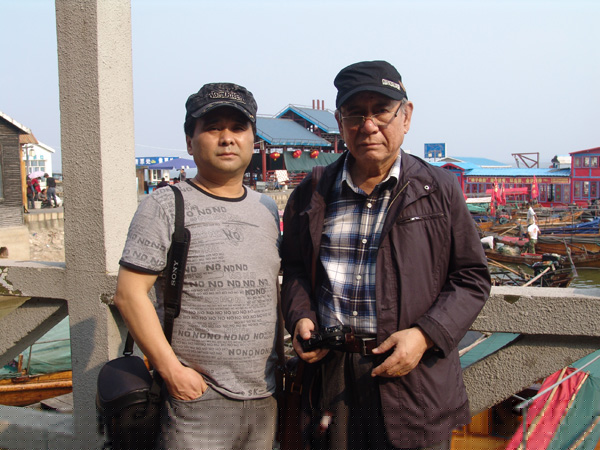 原湖北省文化廳廳長、湖北書畫院院長蔣昌忠(有三),名家典藏出品人郭建、著名畫家李小白在鐘鳴老師師生晚宴前夕合影