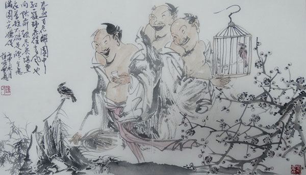 與此同時,藝術(shù)家非常注重簡潔的塊面造型以塑造形象,同時追求大的整體感覺與氣韻,弱化畫面的局部與細節(jié)的描繪,懸置與消解線條的功能性,使畫面營造一種極具光感的、朦朧的與夢幻般的氛圍.作品里的人物即率真、有趣,他們又不乏在情調(diào)上的彼此呼應.藝術(shù)家以書入畫,書法的飄逸、靈動與自由揮灑,與人物的寧靜、閑適構(gòu)成了襯托,使得整個畫面富有情趣與迷人的審美意境.