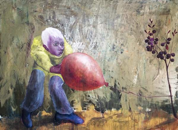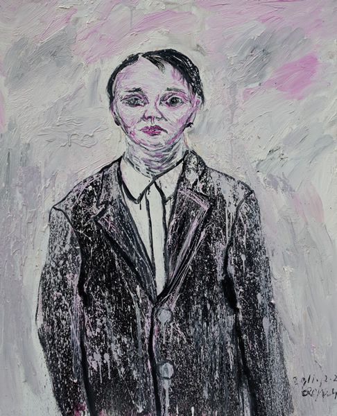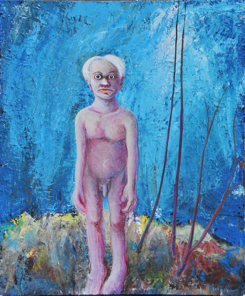 本著自由表達的意念,葛輝在自我繪畫實踐中玩出了自己的味道?此漠嫞拖褫p飄飄踏入了一個奇幻之境。畫里的人物也都輕飄飄施施然地立在略顯迷幻的大背景下,維持著儀式一般的姿態(tài),茫然地瞪著眼睛,看向某處。就像塞繆爾·貝克特筆下的兩個流浪漢,他們?nèi)諒?fù)一日,一直等待著那個只有一個名字,卻永遠不會出現(xiàn)的“戈多”。這種等待當(dāng)然是無稽、荒誕,甚至是虛無,但也是希望。在旁觀者看來,流浪漢的等待毫無意義,而對他們倆來說,雖然等待也是一種煎熬,但他們堅信“戈多”會來,并由此開始一發(fā)不可收拾的等待……