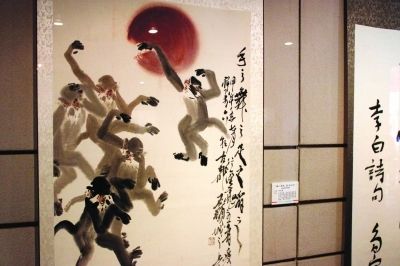 展品中,有江蘇省花鳥協(xié)會會長、南京師范大學(xué)美術(shù)學(xué)院教授徐培晨的一幅《獻(xiàn)瑞圖》猴畫。“猴子撈月”的故事家喻戶曉,但在這幅畫中,猴子們不再結(jié)成“猴梯”去撈水中月,月亮換成了紅日,它們對著太陽手舞足蹈,因此畫中題詞曰:“手之、舞之、足之、蹈之”。63歲的徐培晨告訴揚(yáng)子晚報(bào)記者,南京今年舉行了青奧會,這幅畫就是象征著青春與活力。