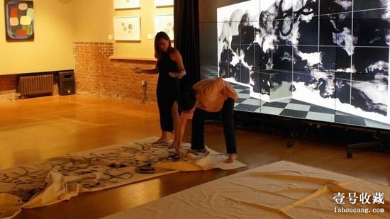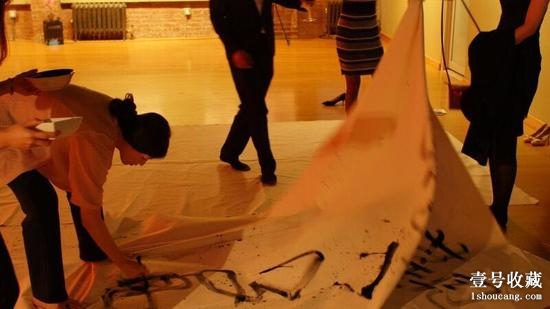 在開幕式期間,戴瑩還當(dāng)場進行了一次行為藝術(shù)的表演。五米多長的畫布平鋪在地板上,戴瑩赤足站在畫布上書寫心經(jīng)。在書寫期間來賓可以通過各種方式上前干擾她的創(chuàng)作。然而不論面對怎樣形式的干擾,戴瑩都能處之泰然,心靜如水的完成創(chuàng)作。藝術(shù)家戴瑩通過這樣的一種行為方式更深層次地表達出人與環(huán)境相處和對抗的關(guān)系。