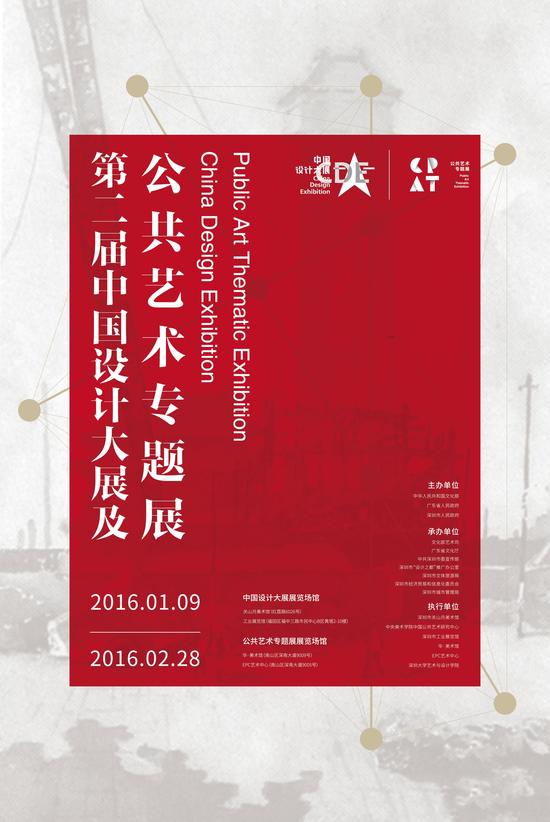 由中華人民共和國文化部、廣東省人民政府、深圳市人民政府主辦,文化部藝術(shù)司、廣東省文化廳、中共深圳市委宣傳部、深圳市“設(shè)計(jì)之都”推廣辦公室、深圳市文體旅游局、深圳市經(jīng)濟(jì)貿(mào)易和信息化委員會(huì)、深圳市城市管理局承辦的“第二屆中國設(shè)計(jì)大展及公共藝術(shù)專題展”將于2016年1月9日拉開序幕,展覽將在深圳市關(guān)山月美術(shù)館、工業(yè)展覽館、華•美術(shù)館、EPC藝術(shù)中心展出。本展覽作為中國迄今規(guī)格最高、最為權(quán)威的設(shè)計(jì)展,旨在通過構(gòu)建專業(yè)、權(quán)威的國家級(jí)平臺(tái),引領(lǐng)和促進(jìn)中國設(shè)計(jì)和公共藝術(shù)的創(chuàng)新。