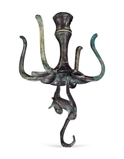 河北博物院藏西漢青銅器《花形懸猿銅鉤》。