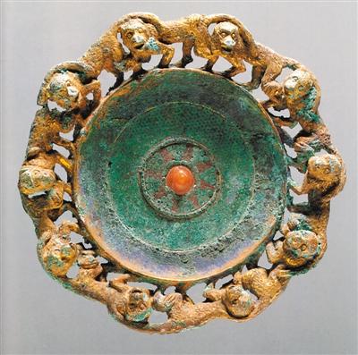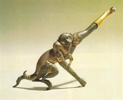 進入青銅時代,猿猴造型仍是人們喜愛的藝術(shù)形象,在青銅文物中可以尋到它各式各樣的身影。山西聞喜出土的青銅《刖人守囿車》,其蓋上有一只立體塑的蹲猴。北京故宮博物院所藏戰(zhàn)國時期青銅《螭梁盉》的蓋紐,同樣鑄成猿猴的形貌。以猿猴造型作為青 銅器裝飾更為成功的例子,是出土于戰(zhàn)國時中山王陵的《十五連盞銅燈》,在托出燈盞的連枝上,塑出許多猴子攀援其上,姿態(tài)各異;燈下還有兩個赤膊男子,正給 群猴喂食,更顯生動有趣。這一時期西南地區(qū)的古代民族青銅文物中,也常有以猿猴造型為題材的藝術(shù)品——云南石寨山滇人墓出土的一件圓形《鎏金銅扣飾》,周緣是連續(xù)爬行的鏤空猴子群像,靈活而有規(guī)律,富于韻律感;江川李家山古滇國墓地出土的一件青銅臂甲上有各種動物刻紋,角落里有一只猿猴的圖像,張臂露齒, 頗為雄奇生動。