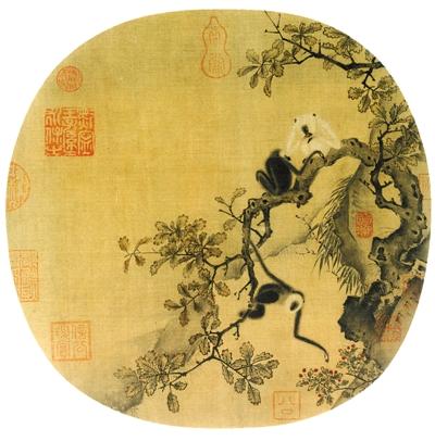 故宮博物院藏宋代中國畫《猿猴摘果圖》。