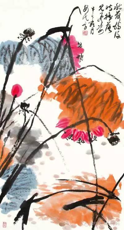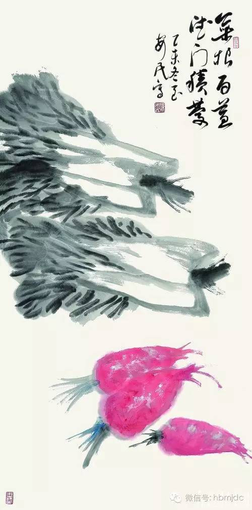 孫安民的大寫意花鳥畫題材廣泛,梅蘭竹菊、牡丹墨荷、瓜果蔬鮮,無所不精。這次展出的孫安民二十幾幅作品中,既有恩師筆意的白菜,清潤雅致的蘭竹、墨色淋漓的荷花、雍容華貴的牡丹、又有蒼勁拙樸的松柏和綻放枝頭的梅花。
