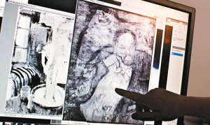2008年,科學(xué)家使用紅外線成像技術(shù)掃描畢加索的作品《藍(lán)色房間》,在圖像之下發(fā)現(xiàn)了這個(gè)系著領(lǐng)結(jié)的男子肖像。畫面中男性有胡須,身體微微前傾,右手托腮!端{(lán)色房間》完成于1901年,與畫中所描繪的女子沐浴形象不符的筆觸,令專家產(chǎn)生了懷疑,并最終發(fā)現(xiàn)了這幅畫中畫,F(xiàn)在困擾專家的問題則是畫中男子的身份,專家已經(jīng)否定了是作者自畫像的可能。目前這幅作品正在韓國展出。
