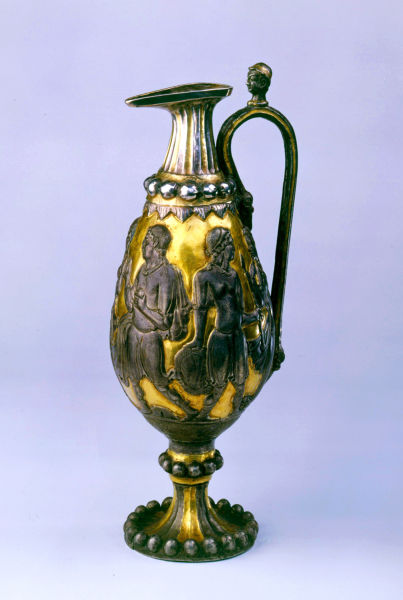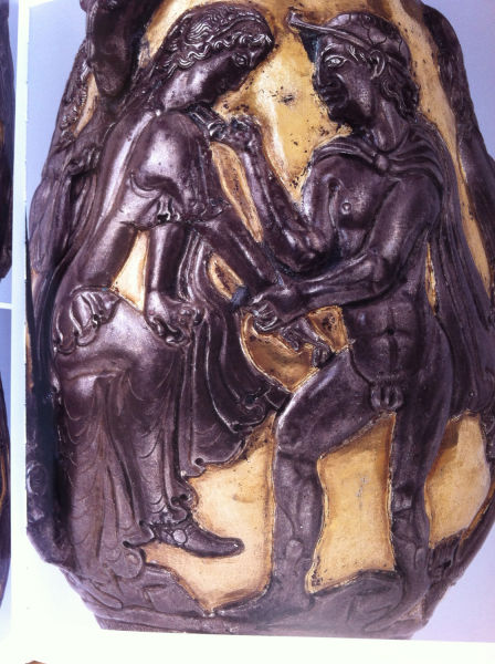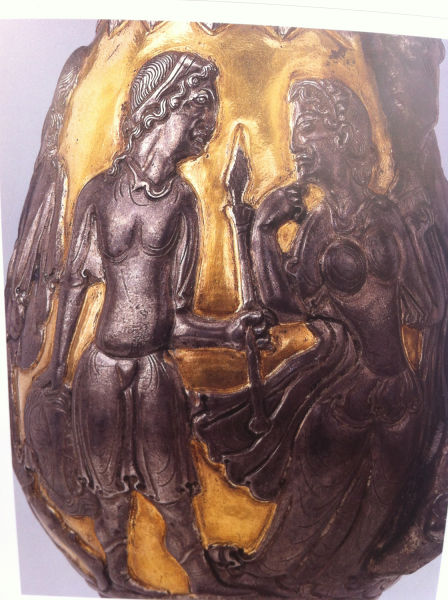 6個(gè)人物展現(xiàn)的故事源于古希臘神話傳說,即“帕里斯裁判”和“特洛伊戰(zhàn)爭”。在古希臘,愛琴海上有個(gè)島國叫特洛阿德,都城為特洛伊。傳承到國王普里阿摩斯時(shí),他的后妻在懷第二個(gè)孩子時(shí),夢見生下了一個(gè)熊熊燃燒的火炬,將特洛伊城燒成灰燼,因此被預(yù)言將給國家?guī)須缰疄?zāi)。于是,孩子生下后就被丟棄,被一名奴隸收養(yǎng),孩子長大后,取名帕里斯,從事牧羊,在牧民中威信很高。有一天,他在放羊時(shí),神的使者赫耳墨斯從天上飛下,帶著3位女神對他說,“我奉宙斯之命帶三位女神來,現(xiàn)在由你評判她們之中誰最美麗,然后給她這個(gè)金蘋果。”帕里斯望著3個(gè)女神,都非常美麗動(dòng)人,聽她們各抒己見,分別是赫拉、雅典娜、阿芙羅狄蒂,最后他決定把金蘋果送給愛情女神阿芙羅狄蒂。以后,帕里斯一直期待著阿芙羅狄蒂的諾言變成現(xiàn)實(shí)。后來,國王在一次賽會上,認(rèn)出了帕里斯是自己遺棄的兒子,就帶回了。后來,對希臘戰(zhàn)爭開始,國王派帕里斯率領(lǐng)龐大的艦隊(duì)出征,途經(jīng)斯巴達(dá)島國時(shí)靠岸,恰逢斯巴達(dá)國王墨涅拉俄斯不在,王后海倫主持政務(wù),海倫是當(dāng)時(shí)世界上最美的女人。帕里斯一見到海倫,就覺得見到了愛神本人,同時(shí)意識到這就是愛神給他的報(bào)酬。于是忘記了使命,搶走了海倫和大批財(cái)寶。帕里斯的這種行徑很快激起了希臘各城邦的憤怒,失去妻子的墨涅拉俄斯聯(lián)合了龐大的陣容,出兵征討特洛伊,引起了著名的“特洛伊戰(zhàn)爭”,經(jīng)過十年激戰(zhàn),希臘人取得了勝利,特洛伊城變成了廢墟,海倫也回到了丈夫墨涅拉俄斯的身邊。這個(gè)故事在銀瓶上有生動(dòng)地反映,第二組人物表現(xiàn)的就是“帕里斯裁判”,男子為帕里斯,手中拿著金蘋果,女子為阿芙羅狄蒂,畫面以一位女神代表三位女神。第三組人物表現(xiàn)的是帕里斯劫持海倫上船時(shí)的情景,畫面忽略了船只。第一組人物表現(xiàn)的是海倫回到丈夫墨涅拉俄斯身邊的情景。由于爭奪海倫引發(fā)了特洛伊戰(zhàn)爭,死傷無數(shù)英雄,墨涅拉俄斯在追回海倫時(shí),準(zhǔn)備殺死?墒,看見她仍然美麗動(dòng)人,就原諒了她。