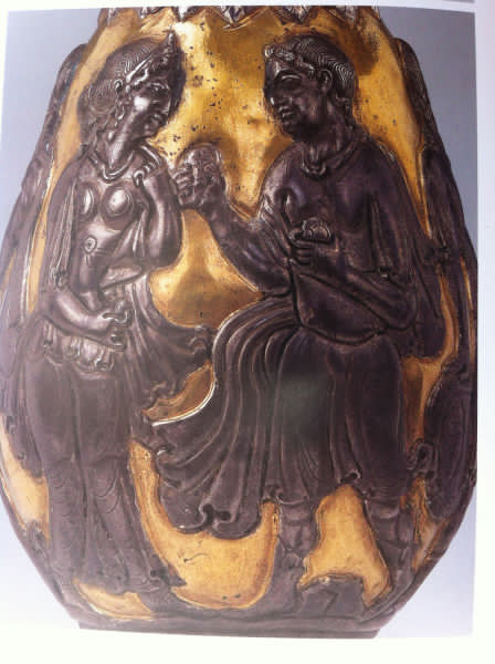 銀瓶上的人物故事雖然源于希臘,實(shí)際上表現(xiàn)了中世紀(jì)西方古典藝術(shù)對東方地區(qū)的滲透傳播。這種形式的金銀器原本是薩珊王朝貴族享用的酒具,而這是一件具有薩珊風(fēng)格的中亞巴克特利亞地區(qū)的制品。在東西方文化交流中,堪稱藝術(shù)精品,通過馳名的絲綢之路流入中國境內(nèi),在寧夏北周李賢墓中出土,無疑是波斯薩珊系金銀器在中國的重大發(fā)現(xiàn),其所表現(xiàn)出的希臘、羅馬藝術(shù)風(fēng)格特點(diǎn),充分體現(xiàn)了希臘文化對世界文化所產(chǎn)生的影響。同時(shí)為證實(shí)中西絲綢之路的昌盛和文化交流的發(fā)達(dá)增添異彩,在東方藝術(shù)品中,與俄羅斯艾爾米塔什博物館、日本美穗博物館收藏的同類薩珊金銀器和國內(nèi)已知的薩珊金銀器比較而言,這是一件絕無僅有的珍品,不啻為“絲路瑰寶”