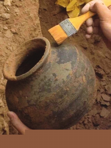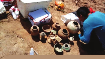 七八天前,在王景寨農(nóng)場附近的一片荒地上,幾臺大型挖掘機(jī)正在開挖平整荒地,不料挖掘機(jī)竟然掘出陶罐樣的東西,幾名負(fù)責(zé)干活的民工馬上就此情況上報武威公安、文物等部門。經(jīng)甘肅省、武威市文物部門和武威市考古所工作人員鑒定,此處為漢代古墓,此古墓所涉面積較大,分為前室、后室。