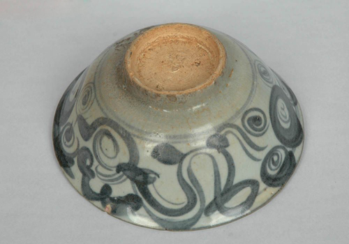 2.胎釉的特征龍泉窯青花盤外足根施釉不夠整齊,有的足圈內(nèi)有釉,有的無釉,釉子有涂抹不勻現(xiàn)象,胎釉結(jié)合處有火石紅出現(xiàn)。這種現(xiàn)象很普遍,常常內(nèi)外釉層很厚,有薄厚不勻現(xiàn)象。內(nèi)側(cè)釉色澤偏青,其胎色也有灰白、灰色、深灰等不同特征。這也是龍泉窯普通產(chǎn)品的基本特征,也是區(qū)別于景德鎮(zhèn)窯的胎釉特點(diǎn)。