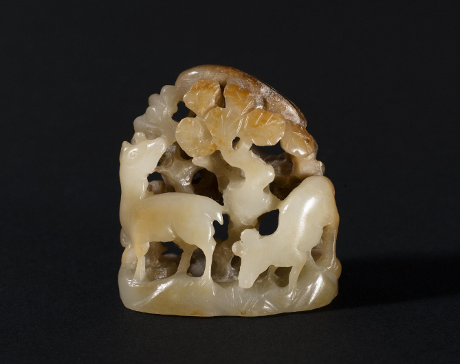 人們將表現(xiàn)遼金皇帝秋季到北方山林中射獵虎鹿熊等動物景象的玉雕作品稱為“秋山玉”。秋山玉是指以山林、虎、鹿、熊為主題的玉器,圖案多為虎、鹿、熊、兔或其它動物,輔以山石、靈芝和柞樹等,虎多作伏臥狀,鹿多作回首站立或奔跑狀。秋山玉多表現(xiàn)為野獸或人與獸共處于山林之間、相安無事的場景。玉多為帶有黃褐色玉皮的白色子玉雕刻,也有部分羊脂玉。采用巧作技法,保留玉皮的黃色,來表現(xiàn)出秋天樹木和虎、鹿、熊金黃色的皮毛,將深秋北方草原天高地闊、禽獸馳騁的山林美景充分展現(xiàn)出來,是契丹、女真族弋獵生活的真實(shí)寫照。秋山玉的藝術(shù)特色是:以景寫情,情景交融,場景恬淡自然,氣氛和諧共生,讓人感受到秋天山林美景的無窮魅力,體現(xiàn)出工匠對大自然以及美好生活的熱愛和憧憬。春水玉和秋山玉反映了遼金元時期游牧民族狩獵的特殊場景,有濃厚的生活意趣。構(gòu)圖巧妙,意境深遠(yuǎn),淳樸自然,畫面充滿了令人回味的山水林野情趣。