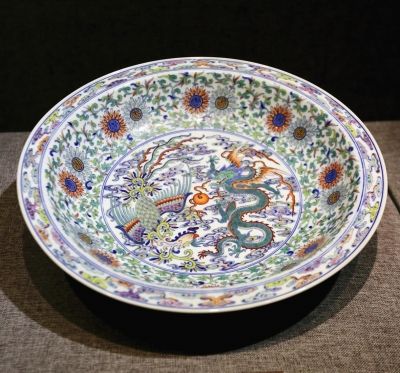 斗彩別名“青花填彩”、“青花點彩”、“逗彩”,是釉下青花和釉上彩色相結合的一種彩瓷品種。此番“紫禁城·揚州·大運河文物展”展出的故宮博物院所藏“清雍正斗彩龍鳳紋折沿盤”可謂斗彩中的精品、典范,揚州人也借此展得以一飽眼福。