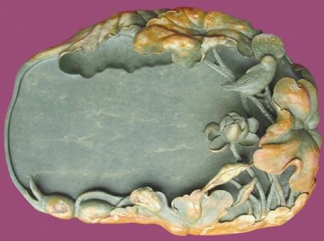 端硯,其材料取于廣東肇慶高要縣東南端溪之爛河山(又稱斧柯山)因其“體重而輕,質(zhì)剛而柔,摸之寂寞無(wú)纖響,按之如小兒肌膚,溫軟嫩而不滑”且有不損毫,宜發(fā)墨的特點(diǎn)。自唐代問(wèn)世以來(lái),便頗受文人學(xué)士青睞。加上紋理綺麗,各具名目,加工技藝亦愈紛繁,地位越來(lái)越高,以致升到我國(guó)石硯之首,長(zhǎng)盛不衰。