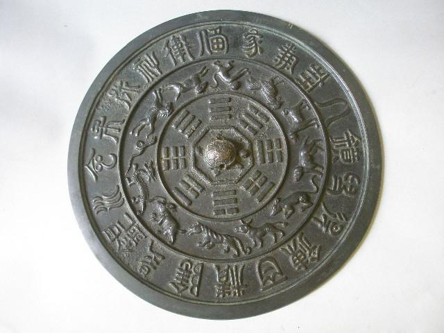 從銹上來說,新仿的銅鏡,它的銹是后做上去的。采取了一些化學的作用,或把一些老銅器上的銹劃下來以后,用膠和起來粘連在上面,可以用水來辨別。仿制品的銅鏡,你把它放在水里,它會出現(xiàn)幾種情況,一種情況就是它不沾水,有銹的地方它不沾水,是逆水的,就象荷葉沾水一樣的感覺。沾水以后,新仿制的銅鏡有這樣幾種味道,一種是硫酸味;一種是臭味,堿燒過的那種臭味;還有一種是銅腥味。就是剛煉出來的銅作成的銅鏡,也有一種銅腥的味道。而老銅鏡一般有一種銅香味,我們說的銅香味,就是出土后的泥土香味。