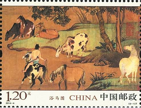 中國郵政在今年3月1日發(fā)行了 2014-4《浴馬圖》特種郵票(圖1、圖2、圖3),一套3枚、小型張1枚。全套郵票面值3.90元,小型張面值6元。該套郵票由王虎鳴設(shè)計(jì),采用連票設(shè)計(jì)形式,并根據(jù)畫面布局,三枚郵票采用不同的郵票規(guī)格。小型張邊飾大膽采用暗綠色,含蓄雅致的金色細(xì)紋,更好地襯托出畫面,整體更顯高雅與精湛。郵票印制則以高精度制版方式,多色復(fù)合膠版印刷,為最大限度保留原畫風(fēng)格,再現(xiàn)其美輪美奐的風(fēng)貌。