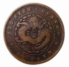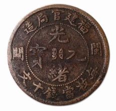 晚清時(shí)期鑄有一種銅幣,稱為“閩關(guān)銅元”。該銅元正面中心有“光緒元寶”四字,珠圈上方署“福建官局造”,下方署“每枚當(dāng)錢十文”,兩側(cè)分列“閩關(guān)”二字,表明其鑄造廠為福建閩海關(guān)銅幣局,故名“閩關(guān)銅元”。錢背中央有蟠龍圖案,珠圈外環(huán)以英文“F—K.CUSTOM—HOUSE”(譯作福建海關(guān))、“10CASH”(十文)字樣,左右兩旁飾有五角花星。這是晚清時(shí)期唯一一所由海關(guān)附設(shè)的銅元局鑄造的銅元。