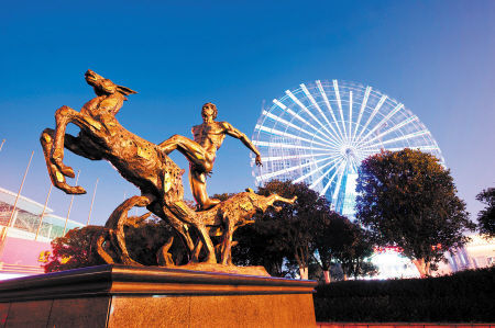 摩天輪下,奔跑不止、運(yùn)動不息的《人與自然》組雕,將運(yùn)動的人與動物放在一起,體現(xiàn)了競技體育的精神,也見證著這個城市的發(fā)展。