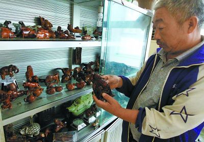 在李秀松家中,收集好的原材料擺滿了一間屋子。拿起一塊黑乎乎的原料剔除雜質(zhì),木雕本身的造型已經(jīng)在李秀松的腦子里被塑造出了工藝品。經(jīng)過數(shù)周的精心雕琢,麻梨疙瘩變成了人們愛不釋手的工藝品。“我原來在潘家園有店鋪,專門銷售自己制作的工藝品,如今市場越來越好,店鋪也不用開了,坐在家里全國各地來采購的客戶就找上門了。”