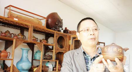 自1994年因?yàn)橐粯渡馀悸愤^宜興,花二三十元搜得尋常紫砂壺一只,一晃二十載,王季成與紫砂壺漸成知音,1500多把器型各異、別具特色的名品紫砂壺早已擺滿家中的四個(gè)大木柜,只明清兩代的老壺就有300多只,其中不乏明時(shí)制壺大師時(shí)大彬的作品及宮廷御用壺,以至不久前,央視《生財(cái)有道》欄目尋到他的門下,做了一期節(jié)目,為全國人民準(zhǔn)備了一場藏品級紫砂壺大觀。