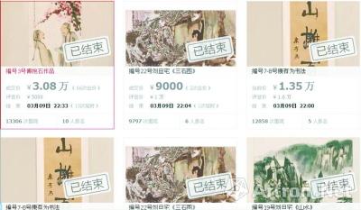 據(jù)了解,這已經(jīng)是甌海法院第二次在網(wǎng)上公開(kāi)拍賣名人書(shū)畫(huà)了。3月2日,包括9件真跡和13件贗品在內(nèi)的22件名人書(shū)畫(huà)作品首次在淘寶網(wǎng)上公開(kāi)拍賣,最終有16件成交,成交率達(dá)77.3%,總成交額34萬(wàn)多元。淘寶網(wǎng)的數(shù)據(jù)顯示,當(dāng)時(shí)單筆拍賣圍觀人數(shù)最多達(dá)5572人次,出價(jià)次數(shù)最多達(dá)44次,延時(shí)11次,單筆溢價(jià)率最高達(dá)150%。