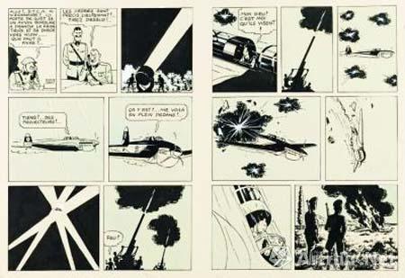 該漫畫手稿由世界知名漫畫藏家Jean-Arnold Schoofs收藏,是比利時(shí)漫畫家埃爾熱1939年7月在Le Petit Vingtième雜志上發(fā)表的作品,畫中使用單線白描技法展現(xiàn)了比利時(shí)記者丁丁(Tintin)與小狗白雪坐飛機(jī)跨過希爾達(dá)維亞邊境,被鄰國波爾多西高射炮轟擊的驚險(xiǎn)場景。