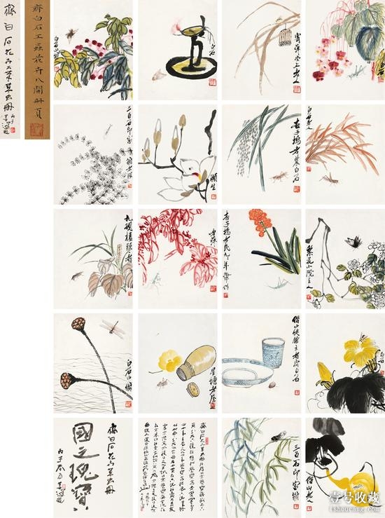 這件齊白石的《花卉工蟲冊頁》十八開可稱目前級別和開數(shù)均屬第一。其中兩開在1955年中央新聞紀錄電影制片廠紀錄片《畫家齊白石》中即已出現(xiàn)。1959年胡佩衡著 《齊白石畫法與欣賞》中也已著錄,此后幾十年經(jīng)多次出版。據(jù)原北京榮寶齋副總米景揚先生回憶,這十八開一直分六個鏡框掛在榮寶齋會客室墻上,后經(jīng)兩次交易被著名收藏家霍宗杰先生一直完整保留至今。齊白石一生中所繪的花卉工蟲冊頁數(shù)量極其有限,蓋因其費時費眼,所以只有對于極其重要的人物,才會聚不知多時之力畫齊一冊。這套冊頁是繼2009年《可惜無聲——齊白石工蟲花卉冊頁》后面世的又一件齊白石繪畫生涯中極為精彩,也數(shù)量最多的一件頂級冊頁。