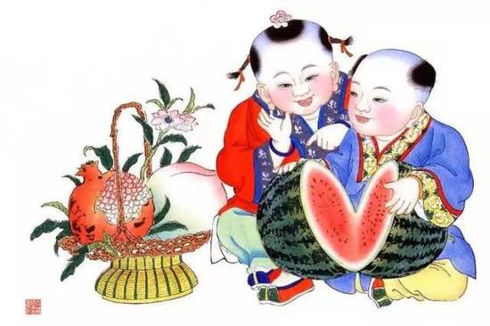 “西瓜”也代表“多子”,所以這張的寓意也是“多子”、“長壽”。