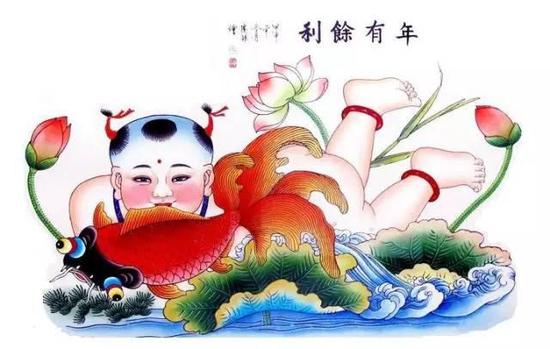 但也有特殊情況,有時候一種事物還可以代表一個副詞,比如這張圖示為“年有余利”的年畫,其實(shí)還可以稱為“連年有余”。畫中的“蓮花”代表一個連續(xù)類副詞。畫中的魚也不是普通的金魚,而是一條“鯰魚”,合起來正好是“連年余”,所以稱為“連年有余”。