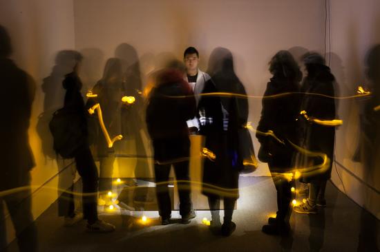 展覽中,觀眾手持蠟燭走進漆黑的展廳,首先會在展廳的內(nèi)壁尋找著若隱若現(xiàn)的文本信息。接著觀眾們會被莫名的聲音吸引來至內(nèi)廳,只見一名身穿白色衣服的,好似祭典司儀的表演者,莊重地為觀眾翻開一本仿佛很古老的大書。這是一本記錄了“攝演師”實踐過程的圖像集。