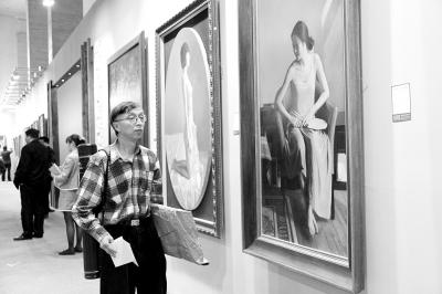 參觀者在北京保利秋季拍賣預(yù)展上欣賞現(xiàn)代油畫。CFP