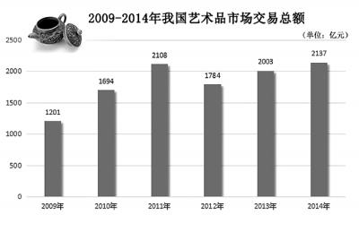 數(shù)據(jù):據(jù)文化部文化市場(chǎng)司發(fā)布的數(shù)據(jù),2009年至2014年,我國(guó)藝術(shù)品市場(chǎng)交易總額分別為1201億元、1694億元、2108億元、 1784億元、2003億元和2137億元,雖有波動(dòng),但整體呈上升趨勢(shì)。然而,2015年我國(guó)藝術(shù)品交易開始“遇冷”。中國(guó)拍賣行業(yè)協(xié)會(huì)、雅昌藝術(shù)市場(chǎng) 監(jiān)測(cè)中心等機(jī)構(gòu)發(fā)布的藝術(shù)品拍賣數(shù)據(jù)顯示,2015年我國(guó)藝術(shù)品拍賣量、成交量同比均有較大幅度下降。