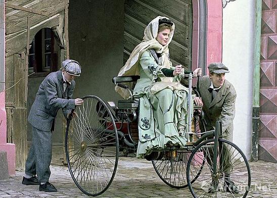 本茨的妻子貝瑞塔.格林正在試驗本茨發(fā)明的汽車