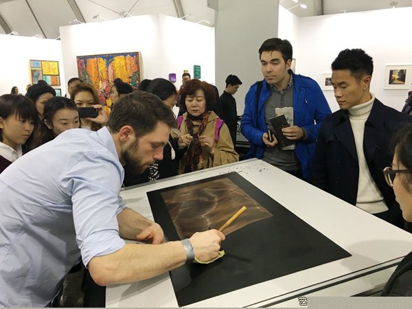 論銷售業(yè)績,香港的畫廊并無太多可圈可點(diǎn)。芳草地當(dāng)代藝術(shù)(Parkview Art Gallery Hong Kong)售出4件作品,價(jià)格從1,500美金到 50,000美金,畫廊工作人員表示這個(gè)成績非常一般。芳草地本次駐場藝術(shù)家的現(xiàn)場創(chuàng)作堪稱全場亮點(diǎn),為配合"Each Line One Breath"系列作品,德國藝術(shù)家John Franzen接連幾日專心于為觀眾表現(xiàn)作品制作的過程,他的作品致力于表現(xiàn)事物起源的規(guī)律,以及這些規(guī)律如何被運(yùn)用到屏息凝神的創(chuàng)作。"Each Line One Breath"系列創(chuàng)作于不同材質(zhì)的物體表面,每呼吸一次,藝術(shù)家便刻或畫下一根線條,并試圖將無限延展的時(shí)間和空間與他生命中某個(gè)瞬間聯(lián)系起來,但在創(chuàng)作過程中,他并不刻意追求某種特定的視覺效果。John Franzen的表演引來一波又一波的觀眾矚目,他的作品亦有售出。