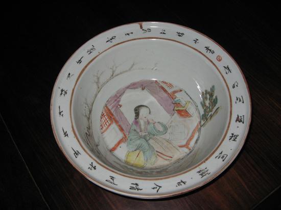 晚清粉彩瓷碗上的蘇小妹。畫面上花紅柳綠,溪水清澈,春風(fēng)吹拂,蕩起一圈圈細(xì)細(xì)的波紋,水中長(zhǎng)著兩簇青青的水草,岸邊的樹枝上花開朵朵,蘇小妹站在船頭,舉著雙手,微笑著看著對(duì)岸。岸上站著她的相公秦少游,她的哥哥蘇東坡及東坡好友佛印,看起來他們也都是一副興高采烈的樣子。蘇小妹是當(dāng)時(shí)著名的才女,經(jīng)常跟 蘇東坡一起外出游玩,跟佛印開玩笑,相互調(diào)侃和對(duì)對(duì)子,巾幗不讓須眉。更經(jīng)典的是蘇小妹在新婚之夜,和相公秦少游一比才智。夫妻二人一邊飲酒,一邊沉浸在 詩文對(duì)聯(lián)的世界里,這便是民間流傳的“蘇小妹三難新郎”的故事。