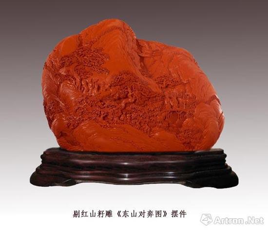 石頭和題材都有了,但又一個(gè)問題接踵而至,如何為不規(guī)則的形體起畫稿?“我們想到,給石頭脫胎的時(shí)候,做兩個(gè),一個(gè)脫好胎后,直接涂漆;另一個(gè)則糊上紙,直接作畫,畫好后,再一塊一塊揭下來貼到涂好漆的胎上雕刻。”經(jīng)過一番嘗試之后,《東山對(duì)弈》這件作品終于誕生了,作品以天然山籽石料為內(nèi)坯形,采用夾纻工藝,構(gòu)思奇巧。山籽之上,山巒疊嶂,飛瀑流淙。《東山對(duì)奕》是紅雕漆山籽雕之首創(chuàng),可謂前無古人。作品展出后,引起了雕漆界的震驚,不少老師傅被張來喜的創(chuàng)新精神和精湛技藝所折服。