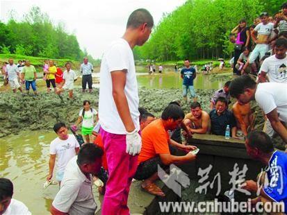 昨日清晨,新洲區(qū)文物管理所5名考古人員,來(lái)到道觀河古墓現(xiàn)場(chǎng)進(jìn)行搶救性發(fā)掘,挖掘機(jī)先在墓周圍筑起小圍堰,再將圍堰中的水抽出,隨即人工刨開 了覆蓋在石板上的一尺多厚的淤泥,河床底古墓的輪廓漸漸清晰起來(lái),古墓呈長(zhǎng)方形,長(zhǎng)有3米多,寬約1.5米,頂部覆蓋著7塊石板。因墓內(nèi)空間有限,只能容 納一人工作,三名考古人員輪流下到墓內(nèi)工作。發(fā)掘現(xiàn)場(chǎng),引來(lái)大量村民圍觀,當(dāng)?shù)嘏沙鏊窬皝?lái)維持秩序。