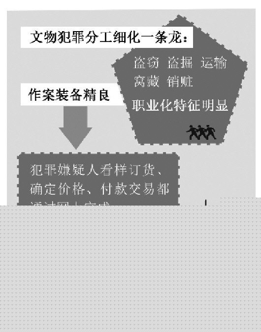 文物犯罪所呈現(xiàn)出的職業(yè)化、規(guī);厔菔沟貌环ǚ肿幼靼甘侄尾粩喾拢踔辆哂泻芨叩募夹g(shù)含量。“從近期偵破的文物犯罪案件來看,犯罪嫌疑人看樣訂貨、確定價格、付款交易都通過網(wǎng)上完成,對講機、夜視望遠(yuǎn)鏡、汽油鋸、照明燈、定位儀、氧氣罐、防毒面具等作案工具一應(yīng)俱全,智能化特征十分明顯,增加了案件的偵破難度。”河北省公安廳刑偵局局長王星亮說。