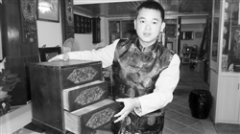 ▲黃天齡展示其藏品丙市怡昌餉當(dāng)?shù)腻X箱。 ▲黃天齡所藏玻璃反畫《三星圖》 ●本報記者曾秋玲 在梅城江南鴻都康居路,聚集著五六十家古董店。黃天齡的心耕堂就是其中一家。精美的木雕、陶瓷,典雅的對聯(lián)、牌匾黃天齡身穿金色唐裝馬褂,腳蹬黑色布鞋,宛如民國...