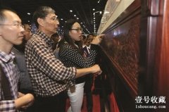 參觀者在欣賞。 昨日上午,元代畫家黃公望的名作《富春山居圖》紅木雕刻版在常熟完成合璧。記者了解到,此次紅木雕刻《富春山居圖》材料選自長11.15米,寬0.45米的整塊緬甸花梨木,框架為馬達加斯加大葉紫檀,總重約3噸。來自海峽兩岸的20多名紅木雕刻師歷時...