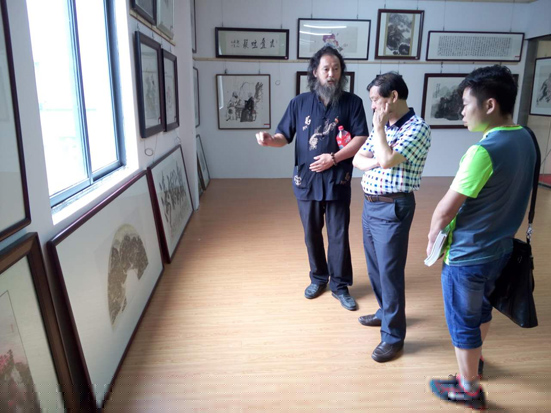 △新華網(wǎng)湖北頻道營(yíng)運(yùn)總監(jiān)何再銘與省收藏家協(xié)會(huì)駐會(huì)副主席俞良玉等在畫展現(xiàn)場(chǎng)