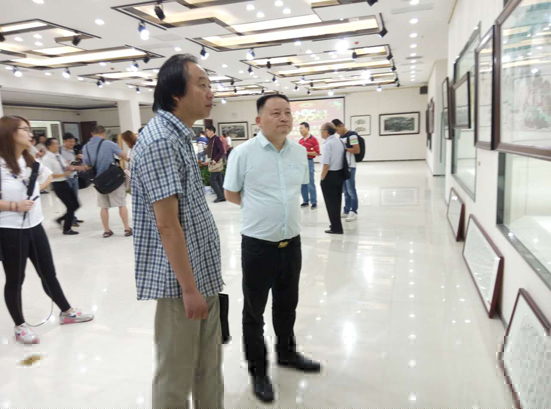 △省收藏家協(xié)會(huì)的副主席程立與酒業(yè)分會(huì)會(huì)長(zhǎng)陳鐵錘在畫展現(xiàn)場(chǎng)