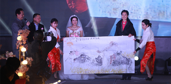 ▲ 張善平主席為本次文化公益活動贈送國畫作品《富貴圖》,并祝名家典藏事業(yè)蒸蒸日上