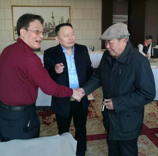 ▲ 武漢市美協(xié)顧問、長江畫派領軍人物魯永歡與全國政協(xié)常委、中華文化交流與合作促進會理事長孫安民親切握手