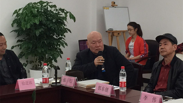 中國(guó)美術(shù)家協(xié)會(huì)理事、安徽省美術(shù)家協(xié)會(huì)主席張松在學(xué)術(shù)論壇研討會(huì)上發(fā)言,中國(guó)畫學(xué)會(huì)理事、福建省畫院院長(zhǎng)、福建省美協(xié)副主席郭東。ㄓ乙唬