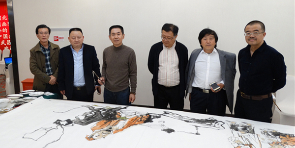 ▲ 院長(zhǎng)畫家們?cè)诠餐瑯?gòu)思創(chuàng)作丈二國(guó)畫《荊風(fēng)楚韻圖》